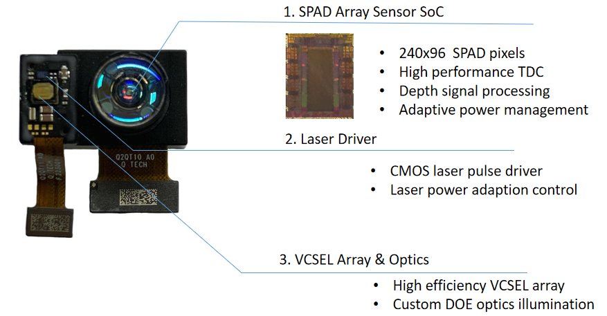 VI4331是一種直接飛行時間(ToF)成像傳感器,集成了240x96個單光子雪崩光電二極管(SPAD)像素陣列、前端時間數字轉換器(TDC)和深度DSP處理器。通過脈沖激光發射器的組合,該傳感器可以返回一個240x96的深度圖像。該傳感器提供支持直方圖模式和DSP模式像素數據格式的MIPI CSI-2接口。此外,它還集成了一個照明控制器和四個激光觸發器,以支持多達四個照明通道的可尋址VCSEL設置。該傳感器包含一個微控制器(MCU),用于實現軟件補丁和增強傳感器的可編程性。它還集成了一個SPI接口,允許在ToF系統中配置下游激光二極管驅動器(LDD),并允許傳感器直接訪問模塊內存(如EEPROM或Flash)上的模塊校準數據和固件代碼。